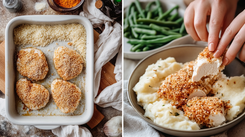 - Bake for 25–30 minutes, or until the chicken reaches 165°F (74°C) internal temperature and the crust is golden brown.