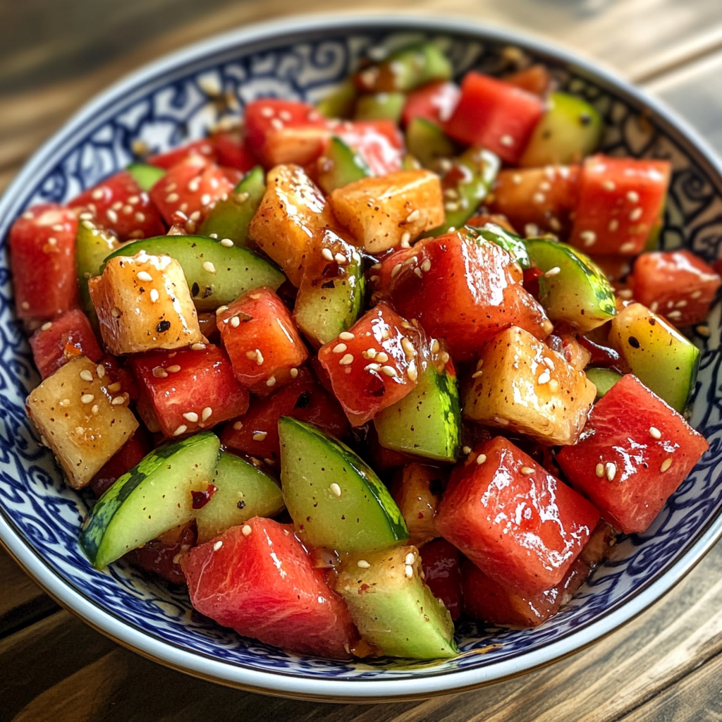 A refreshing salad featuring the often-discarded watermelon peel, perfect for hot days.